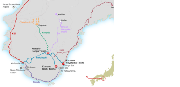 Se ubica en la península de Kii, una de las más grandes de la isla de Honshu (la principal del archipiélago japonés) con ciudades como Kioto, Osaka o Kobe. En concreto hay que desplazarse hasta la región de Kansai. Entre sus siete departamentos, Wakayama es el que concentra gran parte del peregrinaje.