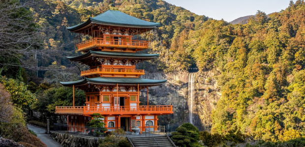- Kumano Nachi Taisha. En la localidad costera de Nachikatsuura (Higashimuro) se encuentra la silueta de la estilizada pagoda de tres pisos con el salto de agua que la enmarca (la cascada de 133 metros de Nachi-no-Otaki). Visitándola se entiende la veneración japonesa por la madre naturaleza. Algo que se puede comprobar subiendo la Daimon-zaka: subir esta escalera de 257 peldaños y 600 metros entre centenarios cedros gigantes es un espectáculo.